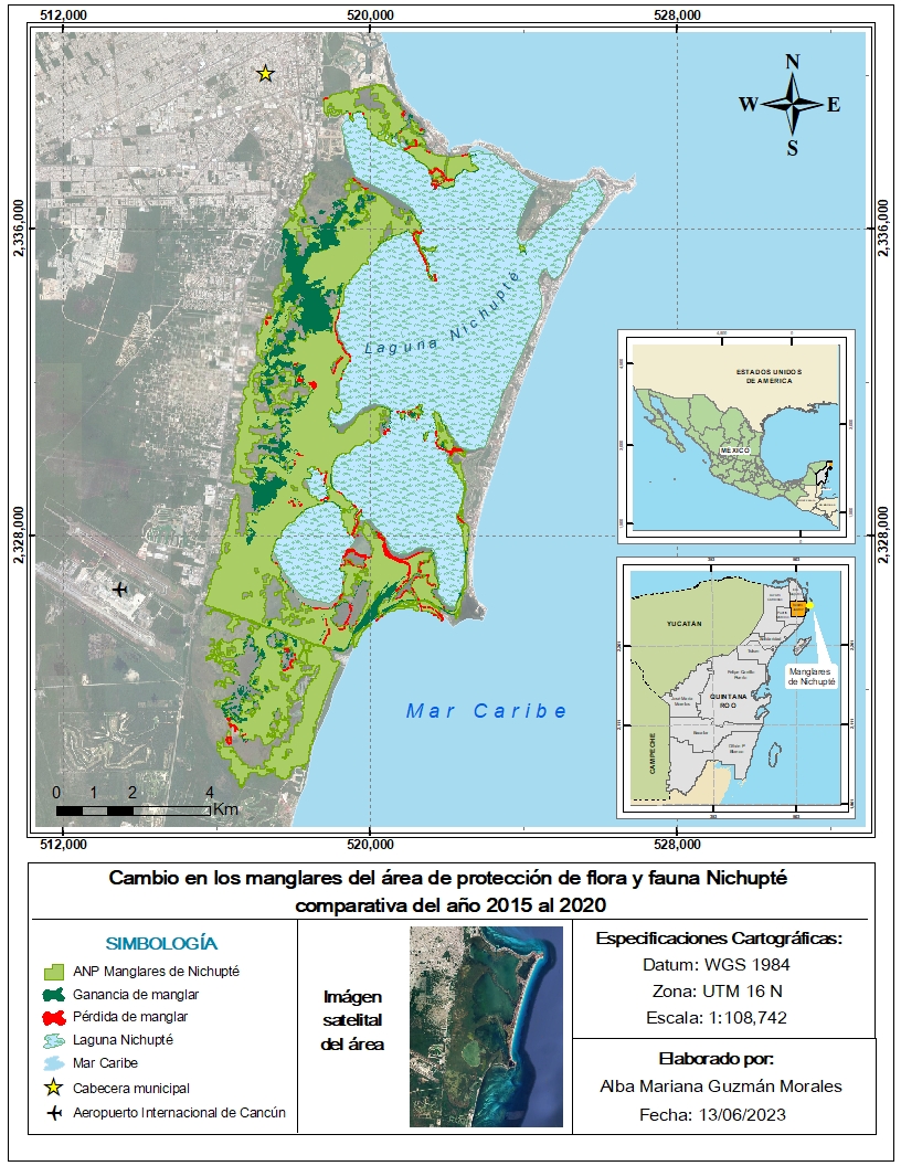 Es posible observar en el mapa que en el periodo del año 2015 al 2020, dentro del Área de Protección existió un aumento en el manglar de 1004 hectáreas, mientras que por otro lado la pérdida fue de 54 hectáreas. Conservando sin cambios un 72 % del Área protegida, lo que refleja que existió un aumento y conservación de la zona bastante favorable.