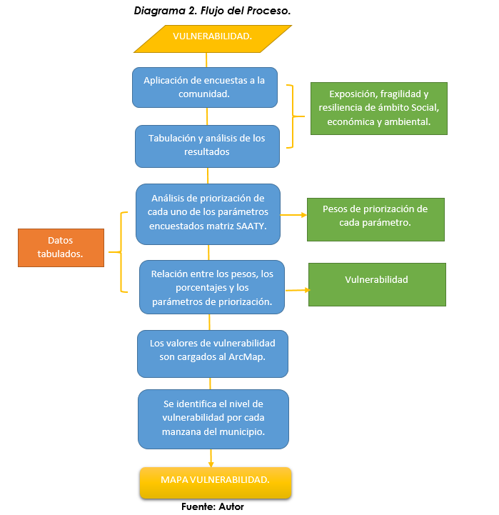 Para identificar el nivel de vulnerabilidad en el área de estudio se realizaron diferentes encuestas aplicadas a los habitantes de la zona urbana del municipio, con el fin de identificar la exposición, fragilidad y resiliencia en el ámbito social, ambiental y económico.