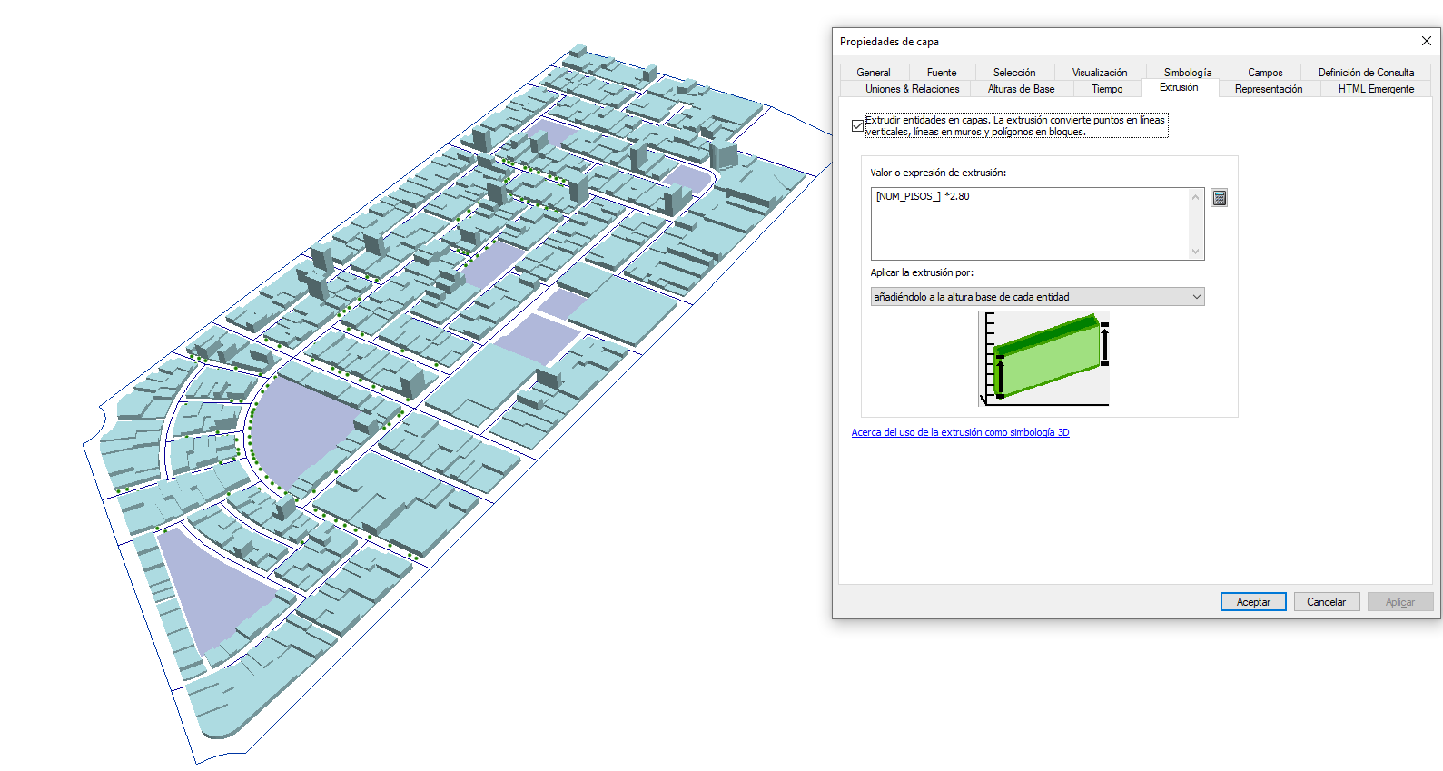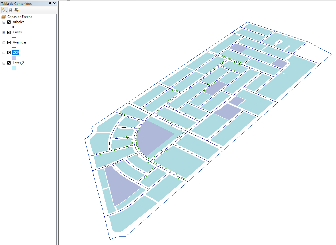 5.4 Simulación 3D: En ArcScene, se realizó la extrusión de elementos tridimensionales a partir de datos de altura obtenidos de Google Earth, generando una visualización realista del entorno construido.