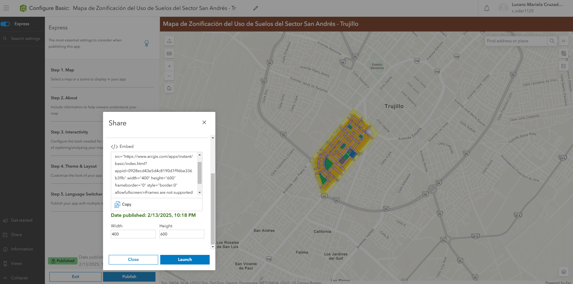 5.7 Creación de aplicación web: Se usó una plantilla de configuración de ArcGIS Online para la visualización interactiva de los datos catastrales, incorporando título de mapa, leyenda y datos detallados de cada predio.