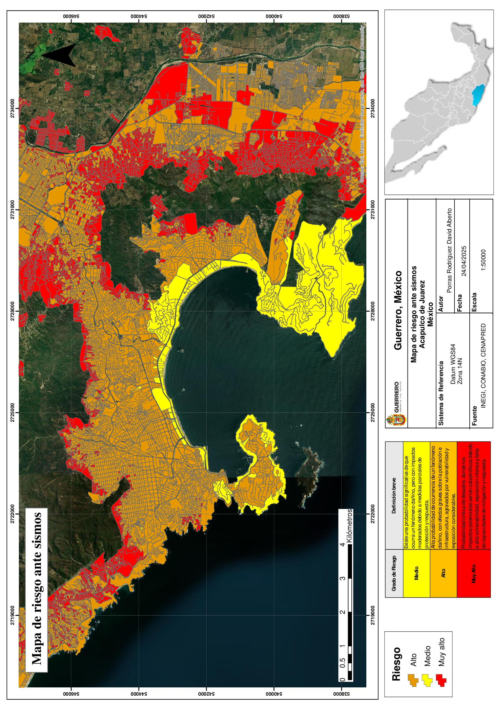Este trabajo tiene como objetivo desarrollar un análisis espacial de la vulnerabilidad y el riesgo sísmico en el municipio de Acapulco de Juárez, Guerrero, utilizando herramientas de ArcGIS. Para ello, se empleará una metodología basada en variables físicas y sociales, lo cual permitirá elaborar mapas temáticos que sirvan como insumo para la toma de decisiones en materia de gestión integral del riesgo, planeación urbana y protección civil. Con ello, se busca contribuir a la reducción del riesgo de desastres y fortalecer la resiliencia de las comunidades ante futuros eventos sísmicos.