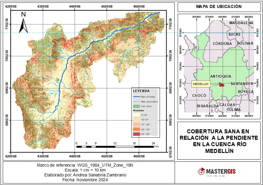Para realizar el análisis de cobertura sana se tuvo en cuenta la clasificación mostrada en la Figura 15, tomando la vegetación alta como vegetación sana. En la Figura 17, se identifican las zonas en las que se encuentra la vegetación sana dentro de la cuenca del río Medellín, las cuales se presentan principalmente en altitudes entre 1500 msnm y 2400msnm como se muestra en la Tabla 1 .