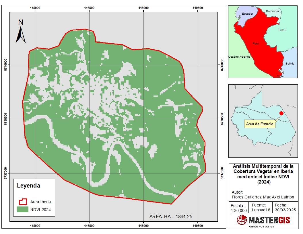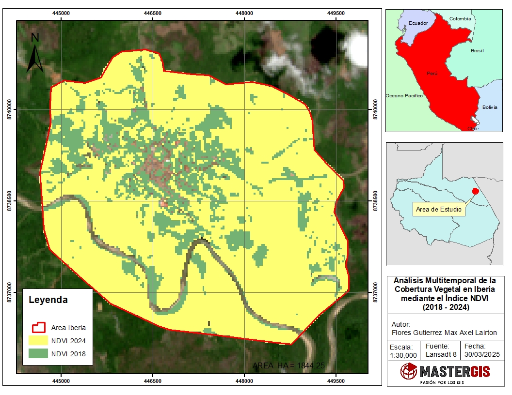 A diferencia de otras ciudades con estrategias avanzadas de sostenibilidad, Iberia aún carece de una planificación territorial eficiente que priorice la conservación de sus espacios verdes. En este contexto, la identificación de cambios en la cobertura vegetal es fundamental para diseñar estrategias de manejo ambiental y restauración ecológica. Los índices espectrales, como el NDVI (Índice de Vegetación de Diferencia Normalizada), ofrecen una herramienta valiosa para analizar la variación de la vegetación a lo largo del tiempo, permitiendo detectar áreas críticas y orientar la toma de decisiones para un desarrollo más equilibrado y sostenible.