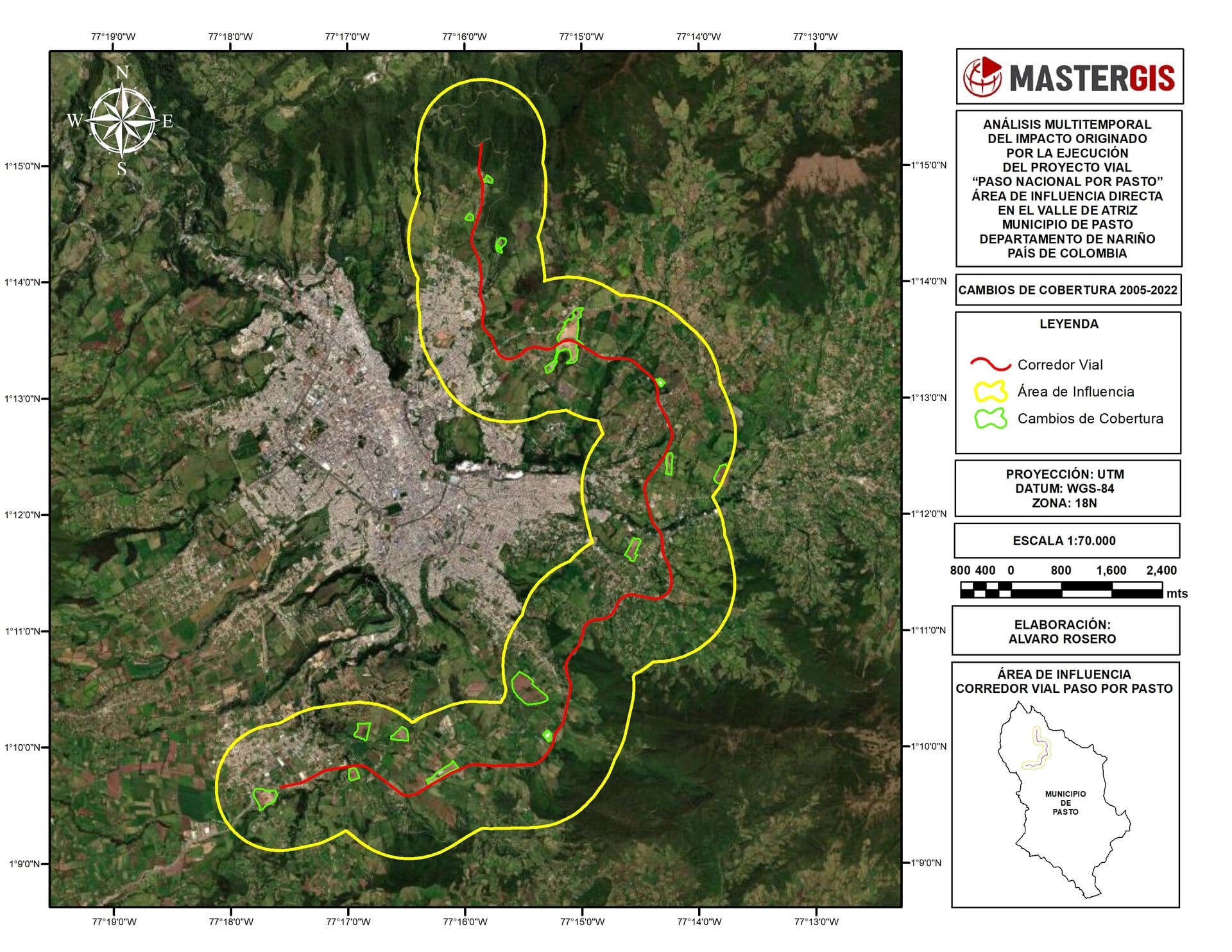 Como se puede observar en la anterior imagen satelital del año 2005; la cual fue extraída desde Google Earth Pro y posteriormente georeferenciada en el software SIG, para este año aún no se había construido el corredor vial, razón por la cual únicamente se representa en la leyenda del mapa el área de influencia de 1.000 metros sobre la cual se construiría el corredor vial Paso Nacional por Pasto para los años posteriores, y más exactamente, entre los años 2011 al 2013 aproximadamente, periodo durante el cual se desarrollaron las obras de infraestructura para este proyecto.