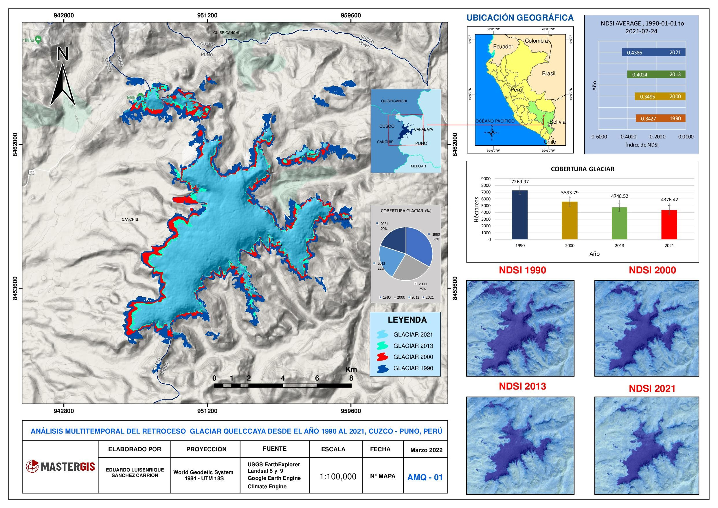 Figura 10. Mapa de Análisis multitemporal del Retroceso Glaciar Quelccaya desde el año 1990 al 2021,Cuzco - Puno,Perú