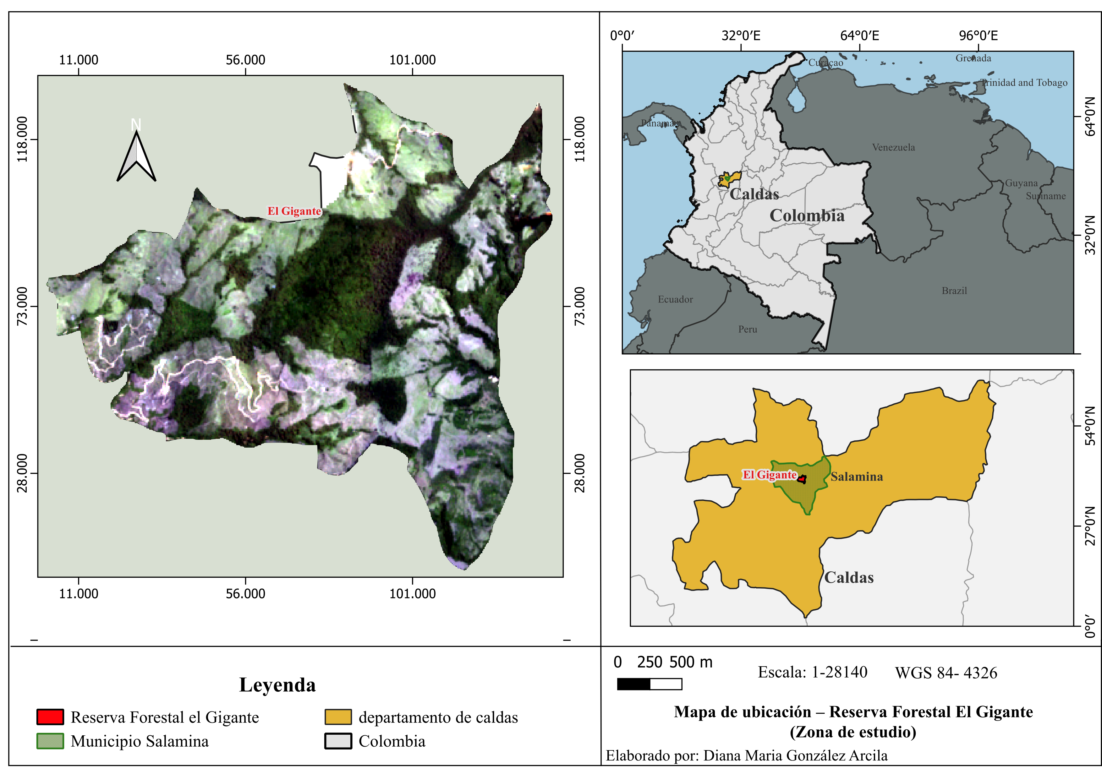 El área de estudio es El Gigante, una reserva forestal ubicada en el municipio de Salamina, Caldas, declarada en 2019 como Distrito de Conservación de Suelos. Su objetivo principal es proteger los bosques, regular el uso del suelo y garantizar la oferta hídrica para las zona rural del municipio. La reserva abarca 729 hectáreas e incluye ecosistemas de alta importancia ecológica, como las quebradas Chagualito y Boquerón, consideradas zonas de conservación. Se han registrado 57 especies de aves, incluyendo tres en categoría de amenaza: la paloma colorada (Patagioenas subvinacea), el terlaque pechiazul (Andigena nigrirostris) y el gorrión montés de anteojos (Atlapetes flaviceps). A pesar de su valor ecológico, la cobertura se encuentra degradada, y gran parte de las reservas forestales del municipio aún no han sido incorporadas formalmente al Sistema Nacional de Áreas Protegidas (SINAP).