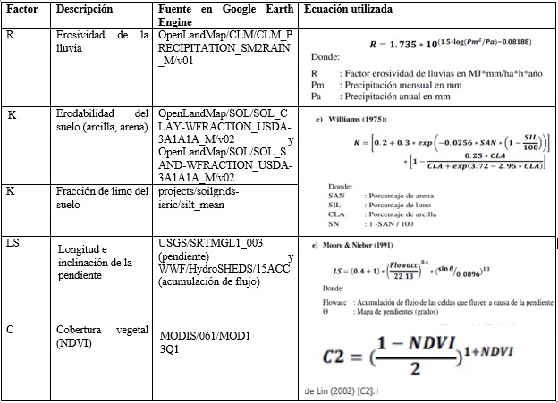 La erosión del suelo se estimó mediante el modelo RUSLE, que integra distintos factores: erosividad de la lluvia R, erodabilidad del suelo K, longitud y pendiente del terreno LS y cobertura vegetal C . Todos los datos requeridos fueron obtenidos de catálogos públicos disponibles en Google Earth Engine, como se resume en la siguiente tabla.
