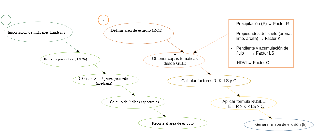 La erosión del suelo es uno de los principales problemas ambientales en regiones tropicales, especialmente en países en desarrollo, donde el uso inadecuado de la tierra y las prácticas agrícolas intensivas han acelerado su degradación (Martínez et al ., 2021). Esta problemática compromete la productividad del suelo, la calidad del agua y la estabilidad de los ecosistemas(Martínez et al., 2022). Frente a esto, la implementación de herramientas tecnológicas como Google Earth Engine (GEE) y modelos como RUSLE, integrados con índices de vegetación como el NDVI, permite estimar la pérdida de suelo de forma remota y tener un acercamiento o monitoreo de estas zonas.