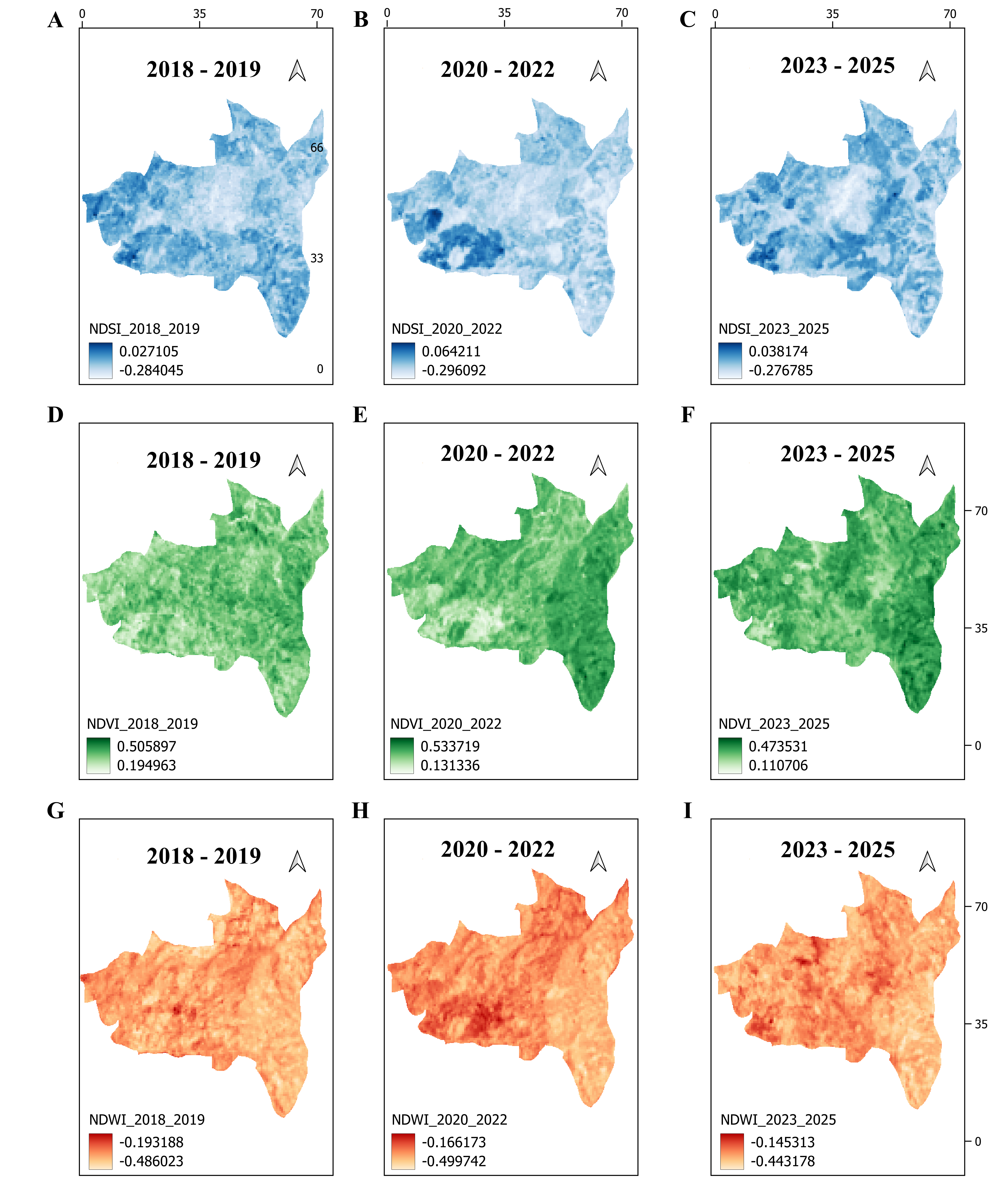 Los índices espectrales (NDVI, NDWI y NDSI) muestran una mejora progresiva entre 2023 y 2025 (Figura 3), especialmente el NDVI y el NDWI, que reflejan una recuperación gradual de la cobertura vegetal y de la humedad superficial. Esta mejora coincide con la declaración de la Reserva Forestal El Gigante en septiembre de 2019, lo que marcó el inicio de un proceso de restauración ambiental en la zona.