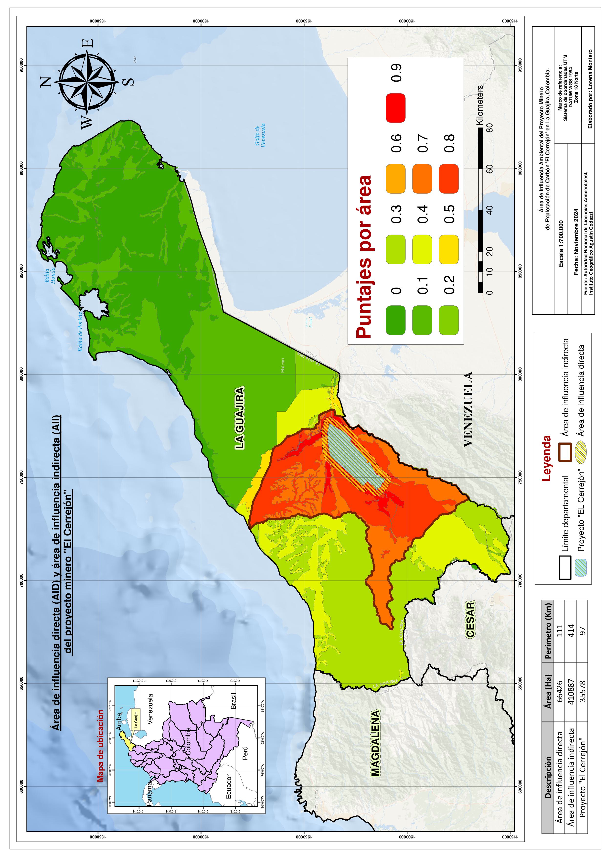 Tras realizar la multiplicación de las variables y aplicar su ponderación, se determinó que el Área de Influencia Indirecta (AII) corresponde a las zonas con valores superiores a 0.7. Estas áreas presentan una alta probabilidad de experimentar impactos ambientales y socioeconómicos significativos. El AII abarca un total de 410,887 hectáreas en el departamento de La Guajira, con un perímetro de 414 kilómetros, lo que resalta la magnitud de la zona potencialmente afectada.