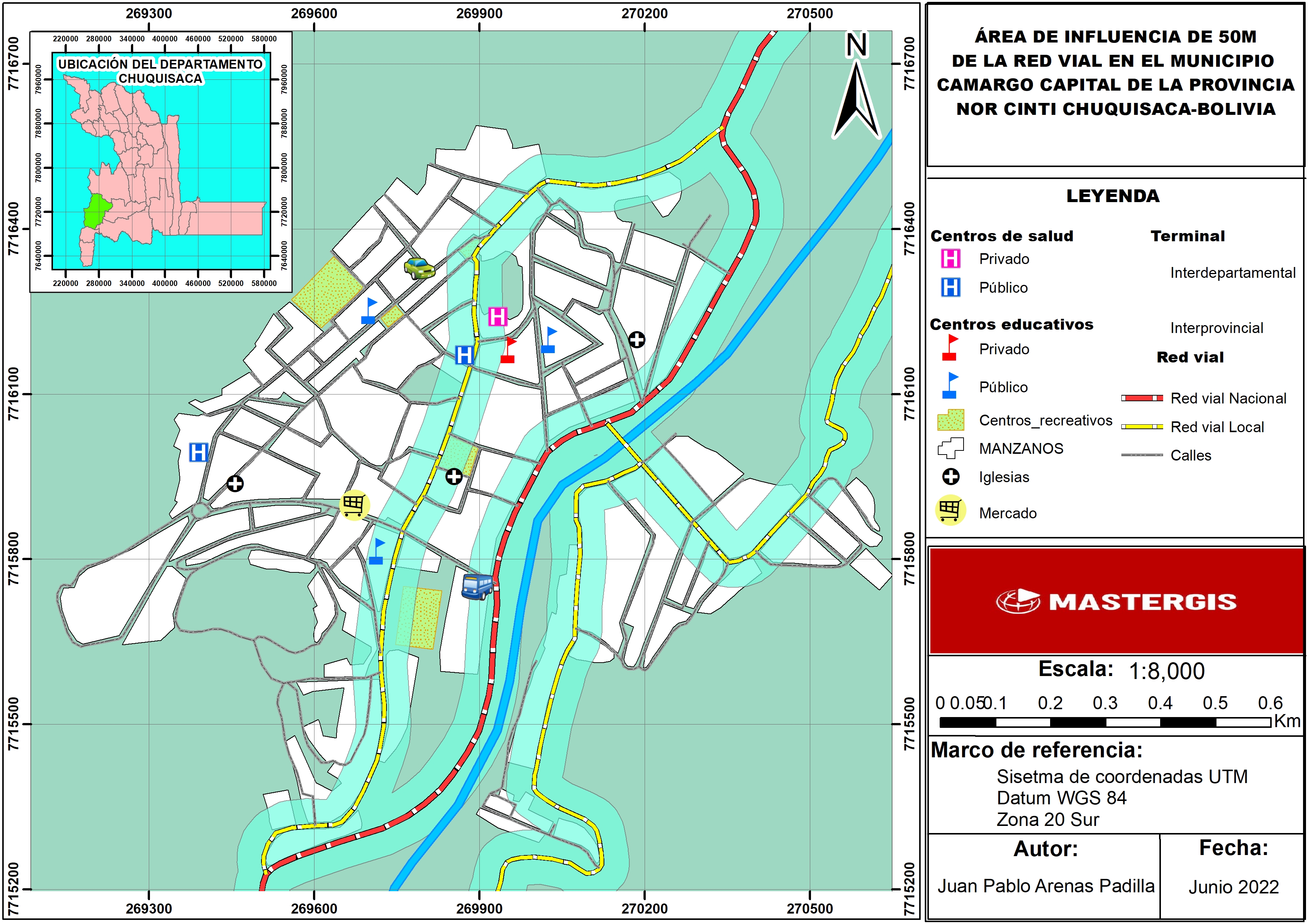 Por otra parte, se visualiza la distribución de los centros de salud, centros educativos, centros recreativos, mercados, etc. Con respecto a la red vial principal y red vial local de la ciudad de Camargo, capital de la provincia Nor Cinti Chuquisaca del estado Plurinacional de Bolivia.