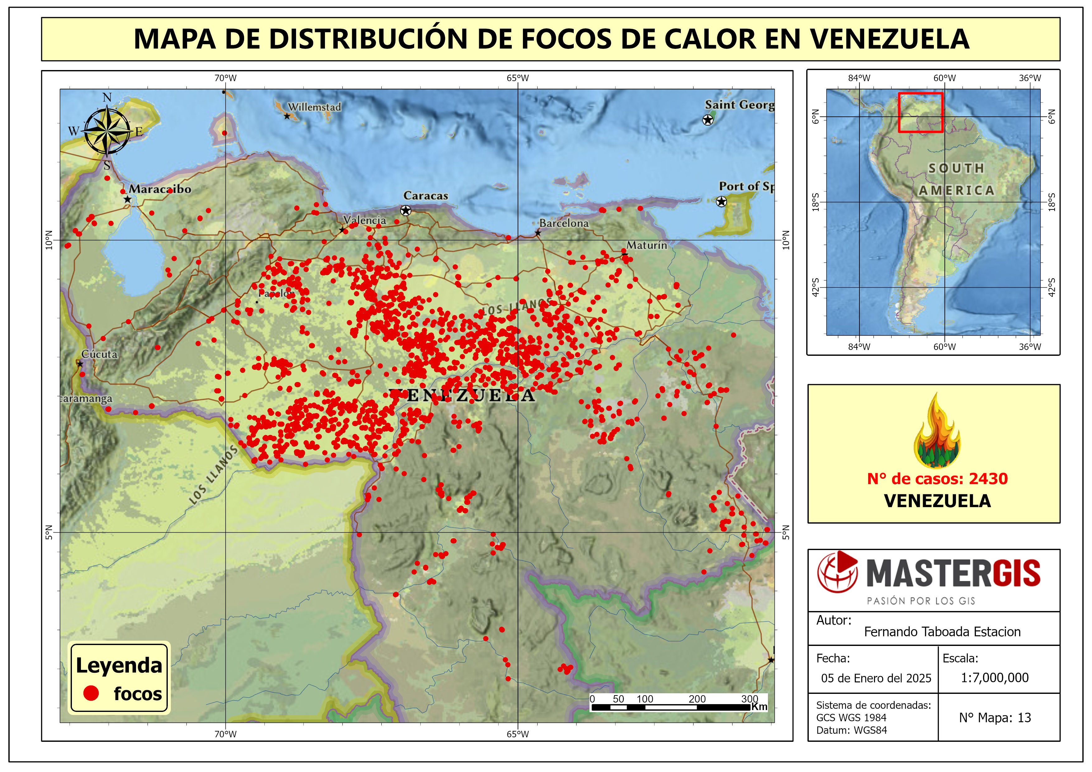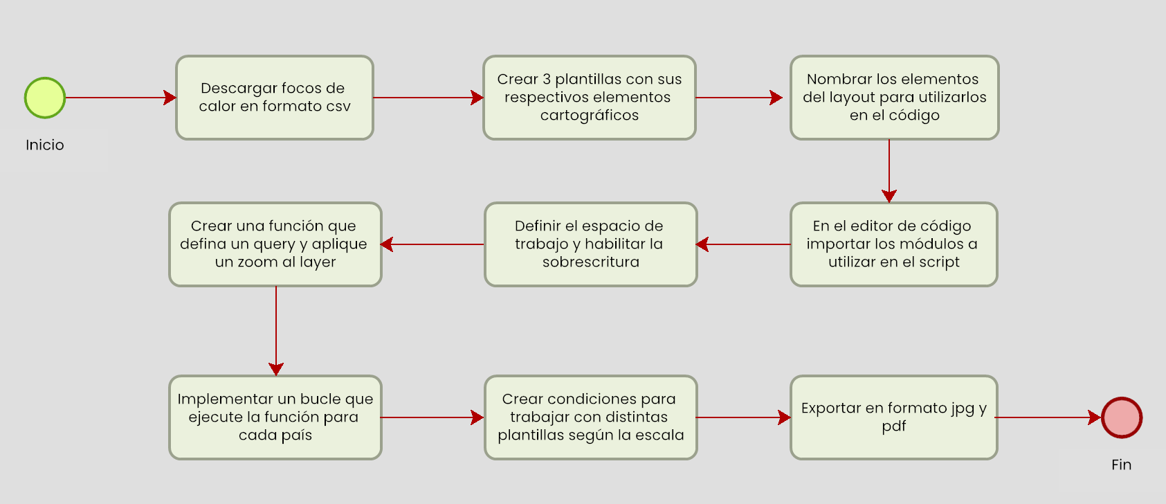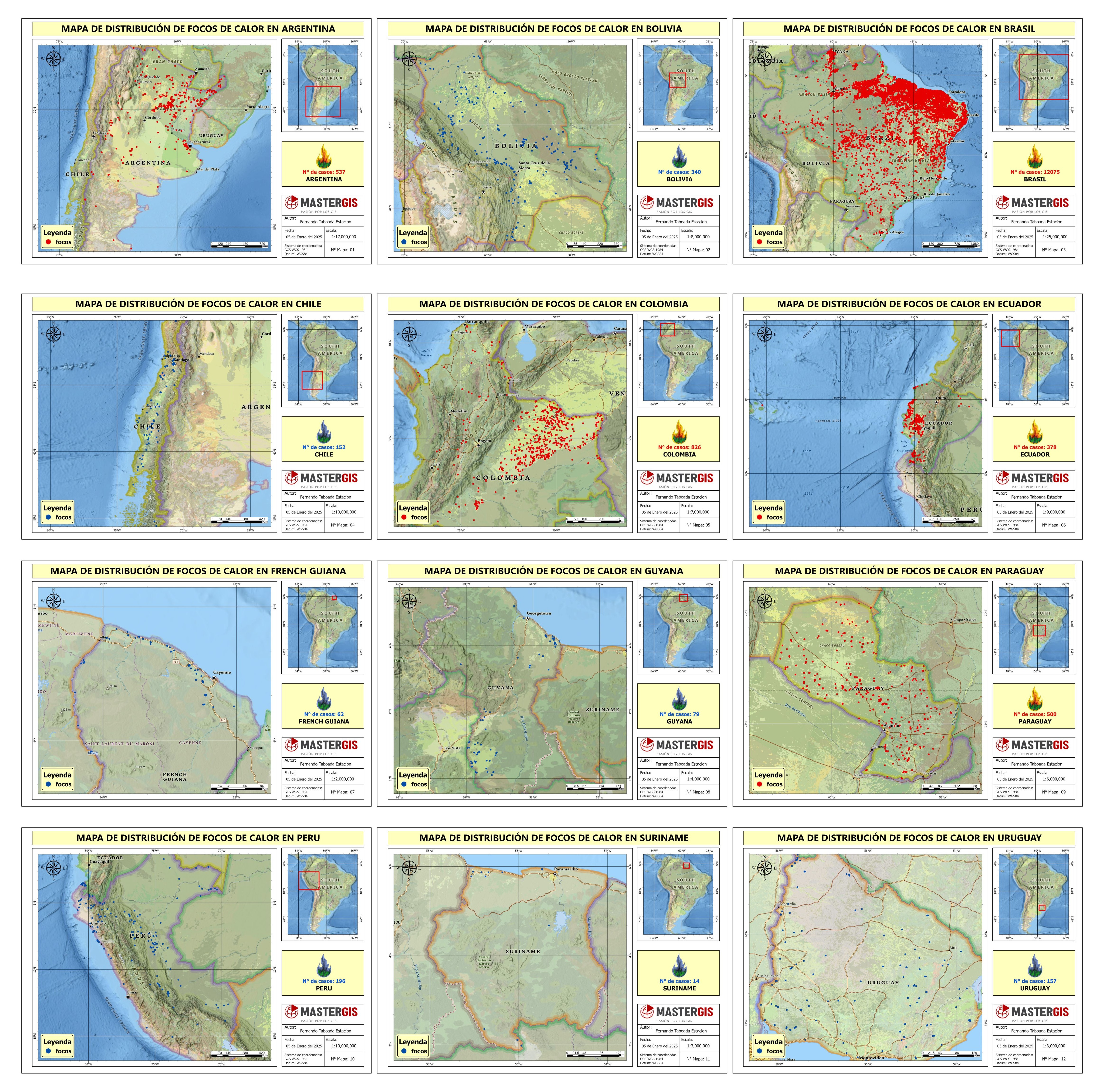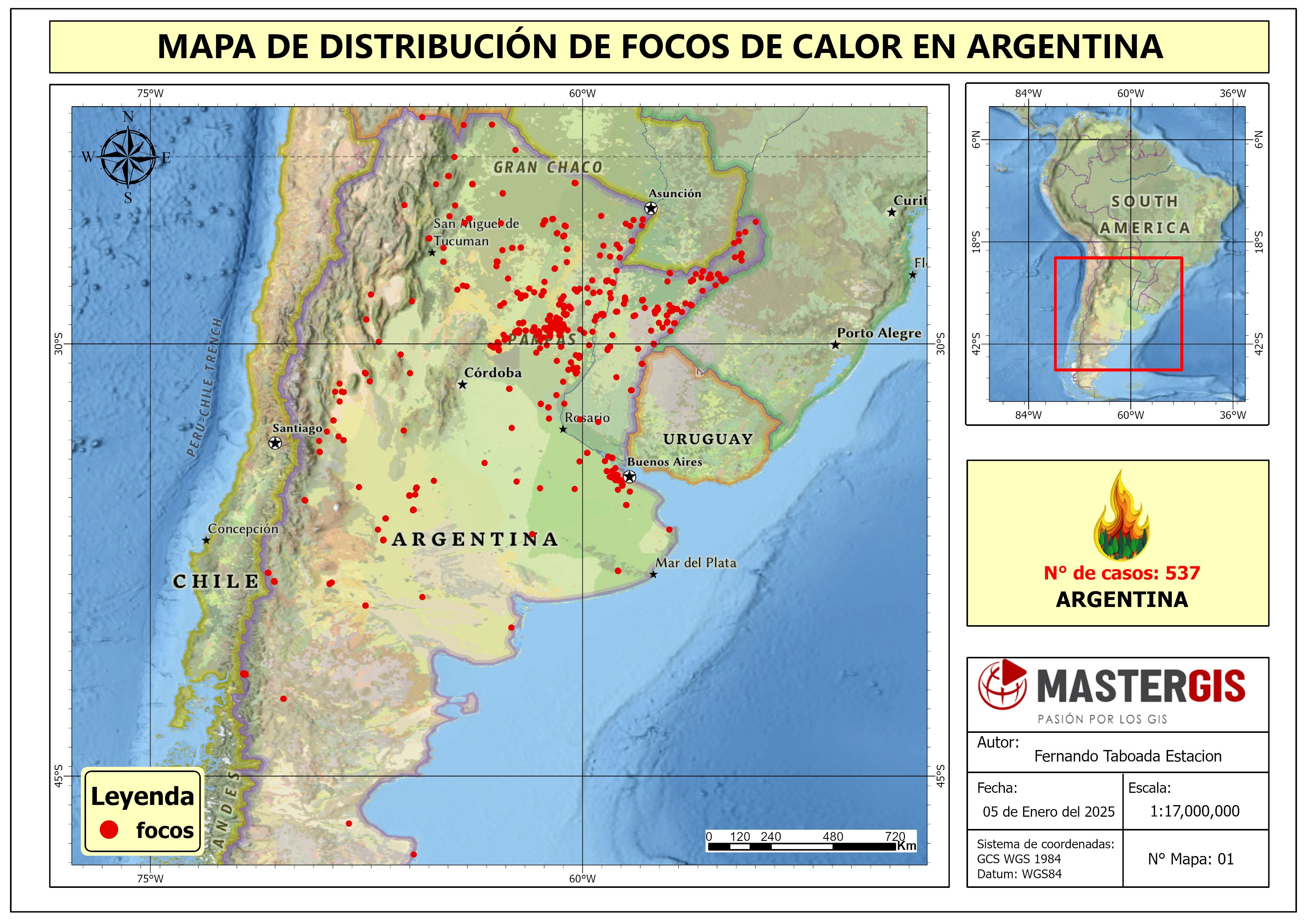 Sin embargo, los métodos manuales de análisis y cartografía de estos eventos suelen ser lentos, propensos a errores y poco eficaces para enfrentar la urgencia de la problemática. Esto resalta la necesidad de sistemas automatizados que optimicen la generación de mapas y análisis espaciales. Este proyecto busca abordar esta necesidad mediante la implementación de un proceso automatizado para la creación de mapas temáticos de focos de calor por país en Sudamérica, utilizando la base de datos Queimadas del Instituto Nacional de Investigaciones Espaciales (INPE) de Brasil y el módulo Arcpy en Python.