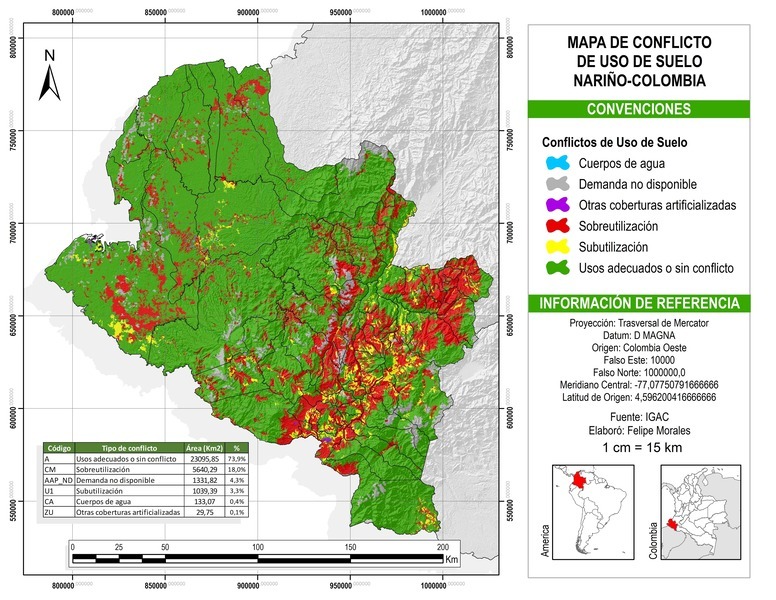 El conflicto de uso del suelo en Nariño es un fenómeno complejo arraigado en su historia y geografía. Desde la época colonial, la región ha experimentado una intensa explotación de sus recursos naturales, lo que ha generado transformaciones profundas en su paisaje (Hoz, 2007). La creciente demanda de tierras para la agricultura, la ganadería y la expansión urbana, sumado a la desigual distribución de la propiedad y los intereses de diferentes actores sociales, ha intensificado las tensiones por el uso del suelo (Martínez, 2022). A esto se suma la vulnerabilidad de los ecosistemas de Nariño a eventos climáticos extremos y la falta de instrumentos de planificación y gestión territorial adecuados. Estas dinámicas han generado una serie de conflictos socioambientales, como la deforestación, la degradación de los suelos, la pérdida de biodiversidad y la inseguridad alimentaria, que ponen en riesgo la sostenibilidad de los recursos naturales y el bienestar de las comunidades locales.