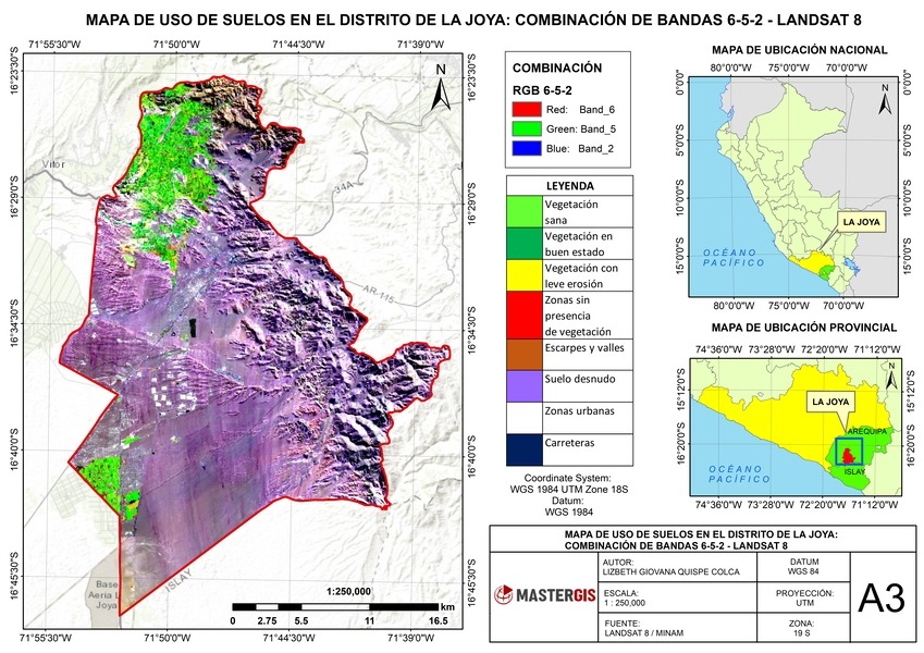 Antes de iniciar la elaboración del mapa final en ENVI, aprovechando la imagen recortada del distrito de La Joya, realizamos la combinación de bandas requeridas por el ejercicio: 6-5-2, definimos un nombre y exportamos la imagen en formato TIFF (Figura 10) para posteriormente usarla para elaborar un mapa más elaborado en ArcGIS.