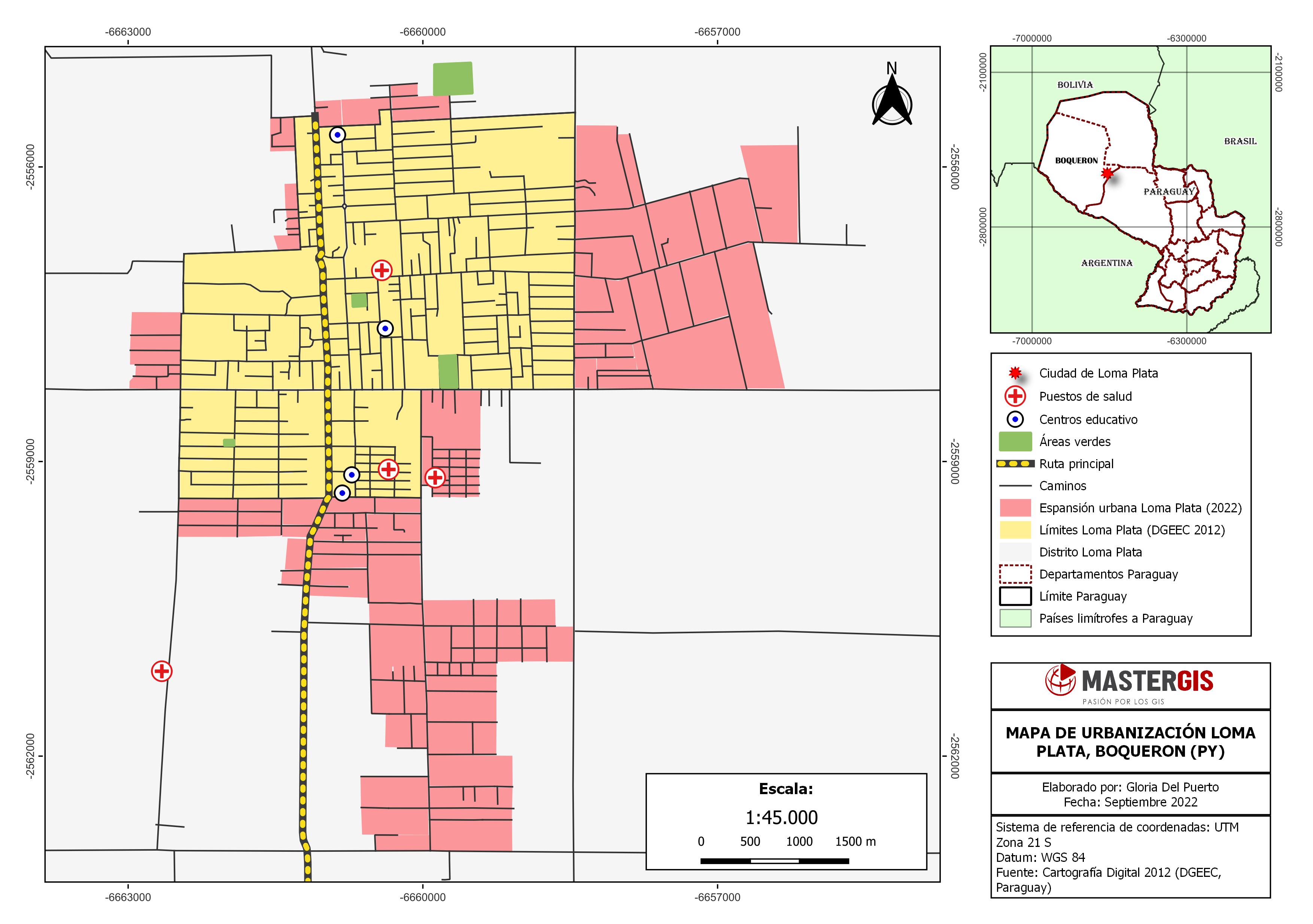 Finalmente para la representación del proyecto, se elaboro el mapa temático, en el cual se visualiza la vista principal de la urbanización con todos sus elementos a una escala de 1:45.000 y una vista secundaria a una escala de 1:20.000.000 donde se señala la ubicación de la ciudad de Loma Plata respecto al departamento de Boquerón en el que se encuentra y su ubicación geográfica a nivel país. El mapa también contempla toda la estructura necesaria para que el mismo sea interpretado por todos los usuarios (orientación norte, escalas, leyenda, sistema de coordenadas, fuentes de información, fecha y autor).