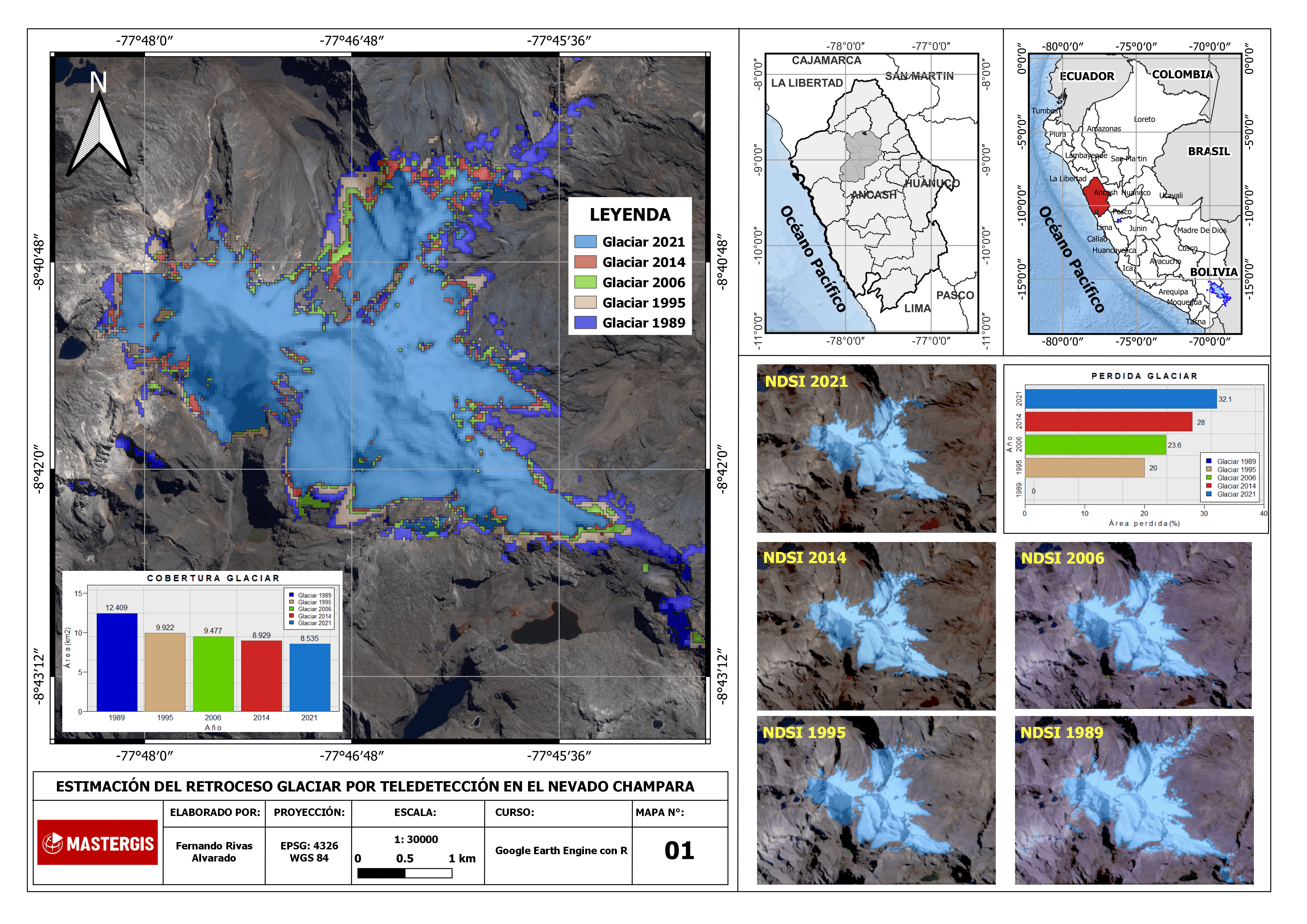 En agosto de 1989 el nevado Champara poseía una superficie glaciar de 12.41 km2, mientras que a agosto de 1995 era de 9.92 km2, lo cual evidencia un retroceso glaciar del 20%, equivalente a 2.49 km2 de superficie glaciar perdida en 7 años (Figura 8). Asimismo, se observó que entre el período 1989-2006 el retroceso glaciar fue del 23.6% (2.93 km2). Sin embargo, entre el período 1989 – 2014 la cobertura glaciar disminuyo en 28.0% lo que equivales a una superficie perdida de 3.48 km2. Cabe desatacar que hasta julio del 2021 la perdida de cobertura glaciar alcanzo los 31.2Km2.