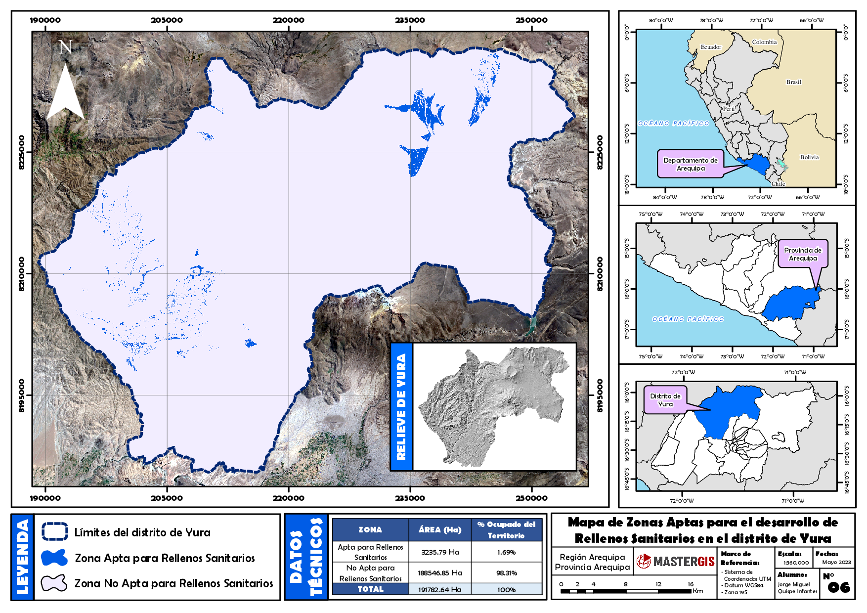 Integrando todas las variables descritas se desarrolló el modelo para identificar las zonas aptas para establecer rellenos sanitarios (Ver Figura 9). Como se aprecia en el mapa, el distrito de Yura abarca 191782.64 hectáreas (Ha), de los cuales, en 3253.79 hectáreas (Ha), que representa el 1.69% del territorio, se puede situar algún relleno sanitario. Destaco las zonas aptas situadas en la parte noroeste, dado que, a simple vista se aprecian grandes porciones de terreno.