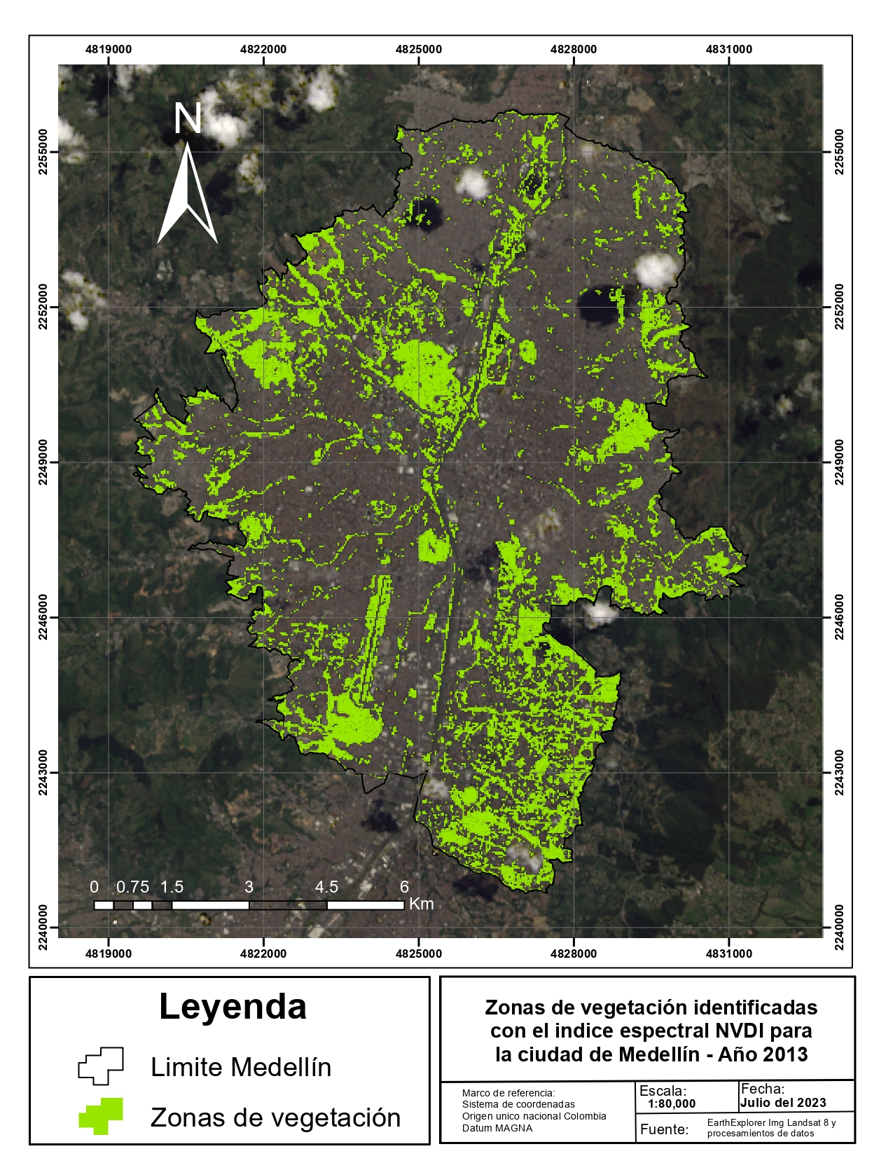 Medellín, es la segunda ciudad más grande de Colombia ubicada en el noroccidente del país, presenta una preocupante escasez de espacio público verde por habitante. La ciudad ha crecido de manera muy acelerada en los últimos años y se ha caracterizado por una expansión desorganizada, una deficiente planificación y ordenamiento, y por la densificación en zonas de ladera y espacios no aptos en zonas de amenaza y riesgo, intensificada por la migración desde las zonas rurales producto del conflicto armado (Fajardo & Echeverry). Teniendo en cuenta la gran limitación que tiene Medellín en espacio público verde comparado con ciudades ejemplo de desarrollo sostenible, se observa la necesidad de impulsar proyectos destinados a crear espacios verdes públicos de calidad, respondiendo a las necesidades que tiene la ciudad. La adecuada identificación de las zonas verdes y los hotspot donde se presentan los mayores cambios es vital para la adecuada planificación del cambio. Partiendo de aquí, los índices espectrales como el NVDI son de gran ayuda para mejorar y optimizar estos procesos, debido a que nos permite identificar estos lugares rápida y eficientemente.
