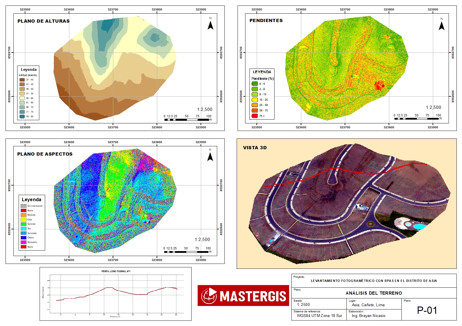 Estos productos son cargados a software GIS para su tratamiento y enmarcación en los planos requeridos como plano de pendientes, plano de aspecto y plano de alturas. Se agregó además una vista 3D de la superficie y un perfil longitudinal del mismo.