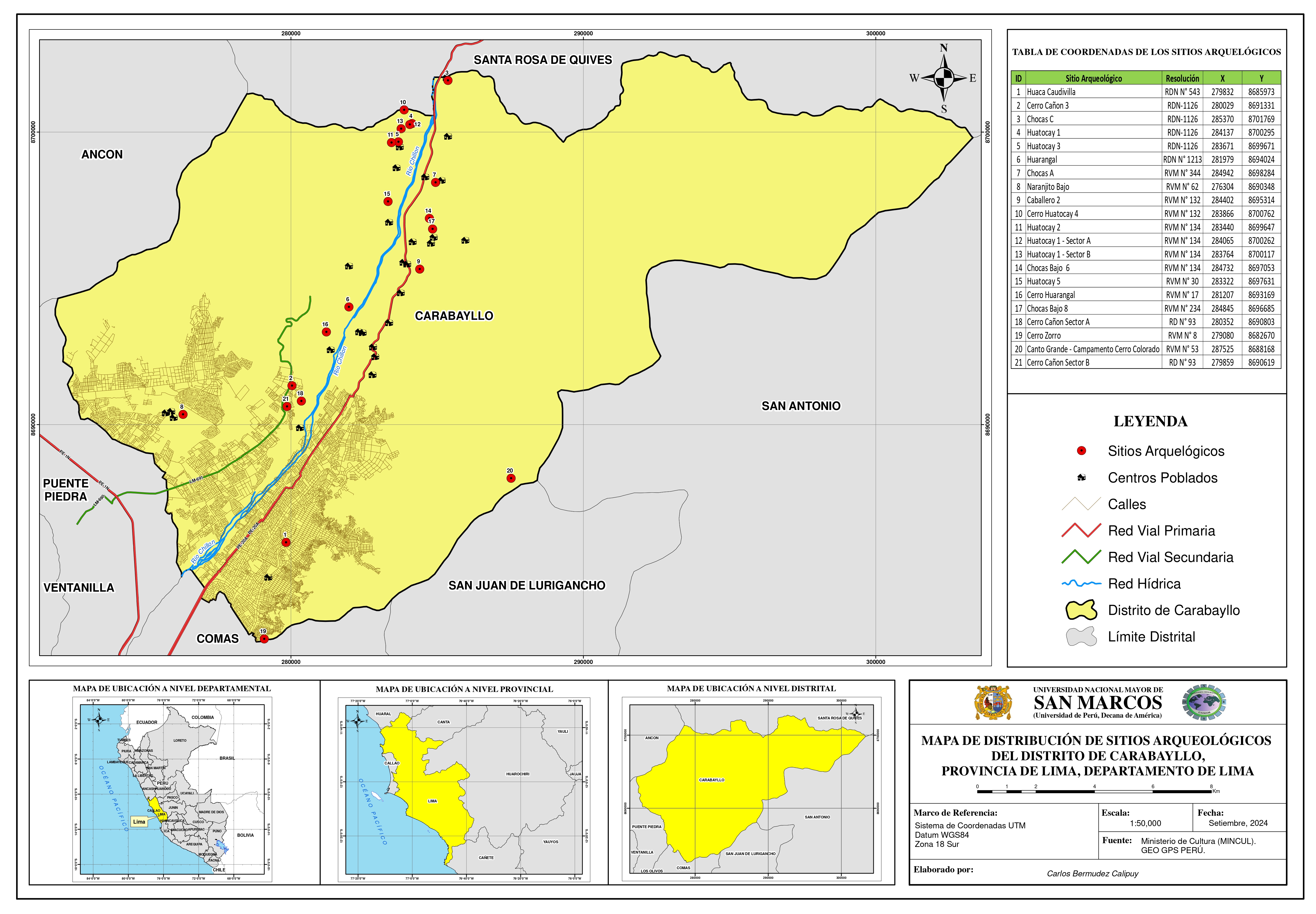 Como resultado se obtuvo un mapa donde se puede visualizar que el distrito de Carabayllo cuenta con 21 sitios arqueológicos que se encuentran declarados por el Ministerio de Cultura hasta el presente año, los cuales la mayor cantidad de estos están distribuidos cerca a los margenes del río Chillón. También se pudo obtener una tabla en el cual se encuentra las coordenadas UTM de cada uno de los sitios arqueológicos.