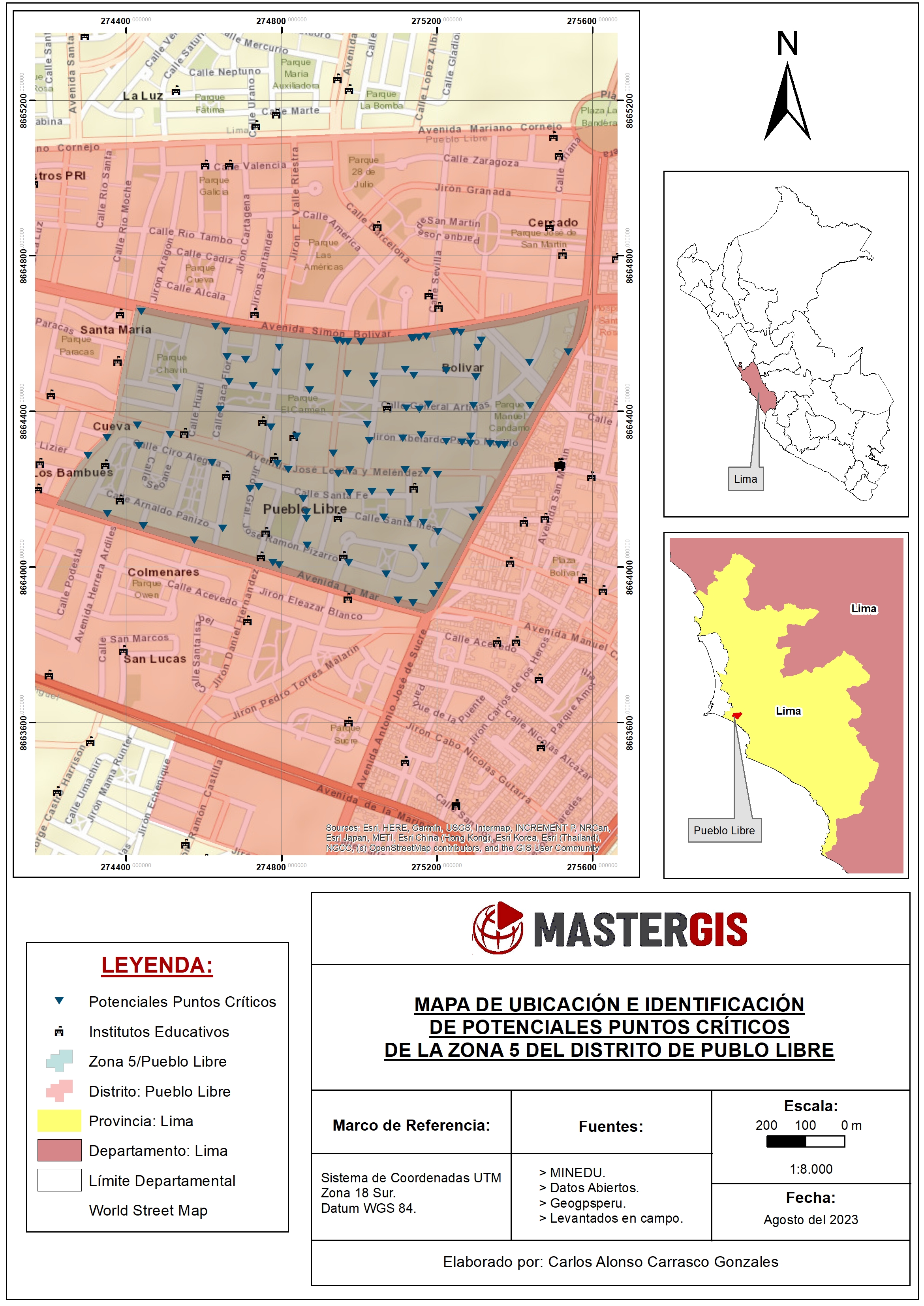 Una vez definida el tema del proyecto se identificaron los insumos necesarios para la producción de este. El área de estudio se limita a la Zona 5 del distrito de Pueblo Libre, shapefile que tenía que ser creado; y los puntos georreferenciados de los potenciales puntos críticos que se identificarían, los cuales fueron tomados con ayuda de un aplicativo llamado Map Marker, ya que no cuento con un dispositivo GPS. En todo momento se trabajó en el Sistema de Coordenadas Proyectadas UTM Zona 18 Sur.