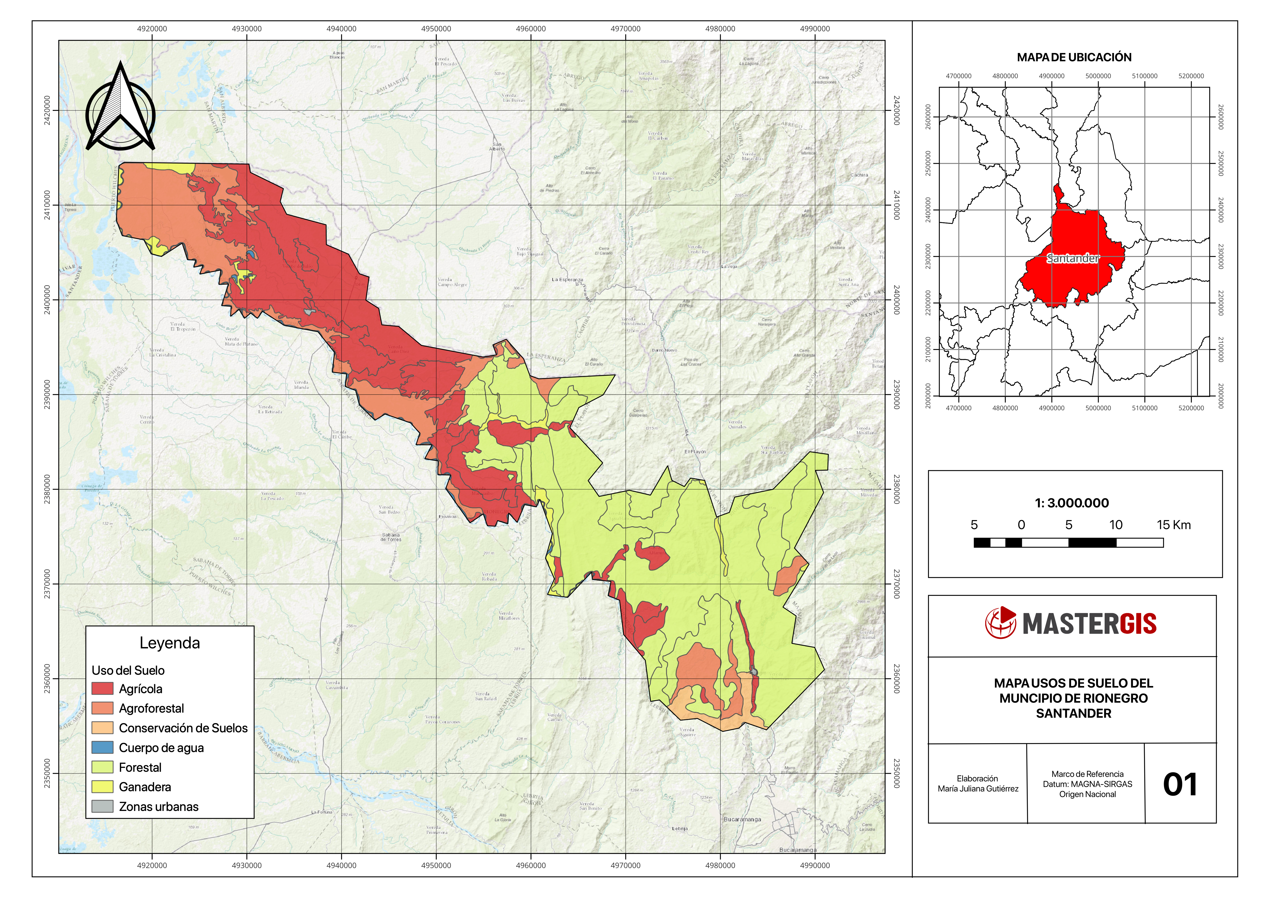 Crear el mapa de distribución de usos de suelos del municipio de Rionegro en el departamento de Santander, Colombia.