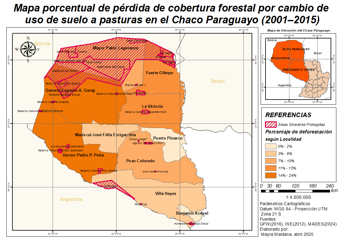 El mapa temático final muestra una distribución desigual del fenómeno. Las localidades más afectadas —como Gral. Eugenio A. Garay, Doctor Pedro P. Peña y Fuerte Olimpo — presentan niveles de deforestación entre 11% y 24%, evidenciados por los tonos más oscuros. En contrapartida, áreas como Benjamín Aceval, Puerto Pinasco y Villa Hayes muestran porcentajes significativamente menores (entre 0% y 2%), lo que sugiere una menor presión de cambio de uso de suelo. En cuanto a las ASP, muchas se encuentran rodeadas por zonas de alta deforestación, lo que puede comprometer su integridad ecológica. Ejemplos de ello se observan en áreas como Defensores del Chaco, Teniente Enciso o Río Negro.