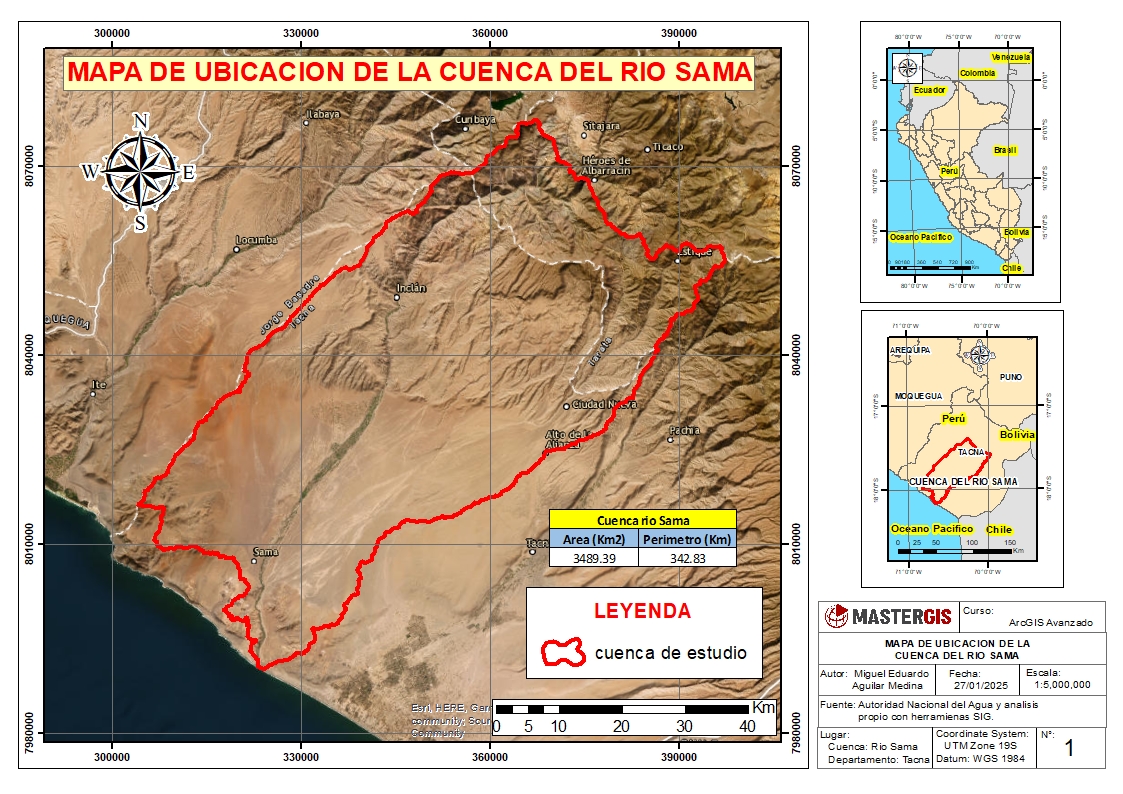 La cuenca del río sama, se encuentra en la costa sur del Perú, en el departamento de Tacna, El río Sama nace en la laguna de Cotanvilque y desemboca en el mar de Grau. representa un sistema hidrográfico de gran importancia para las actividades agrícolas, económicas y ambientales de la zona. El modelamiento de su red hídrica, que incluye tanto las redes primarias como secundarias, permite comprender la dinámica fluvial y la interacción del agua con el paisaje. A través de herramientas geoespaciales avanzadas, es posible generar modelos derivados como pendientes, hillshade, aspecto, densidad de Kernel, visibilidad, y análisis de relieve, que facilitan el entendimiento de los procesos geomorfológicos y su relación con los recursos hídricos en la cuenca.
