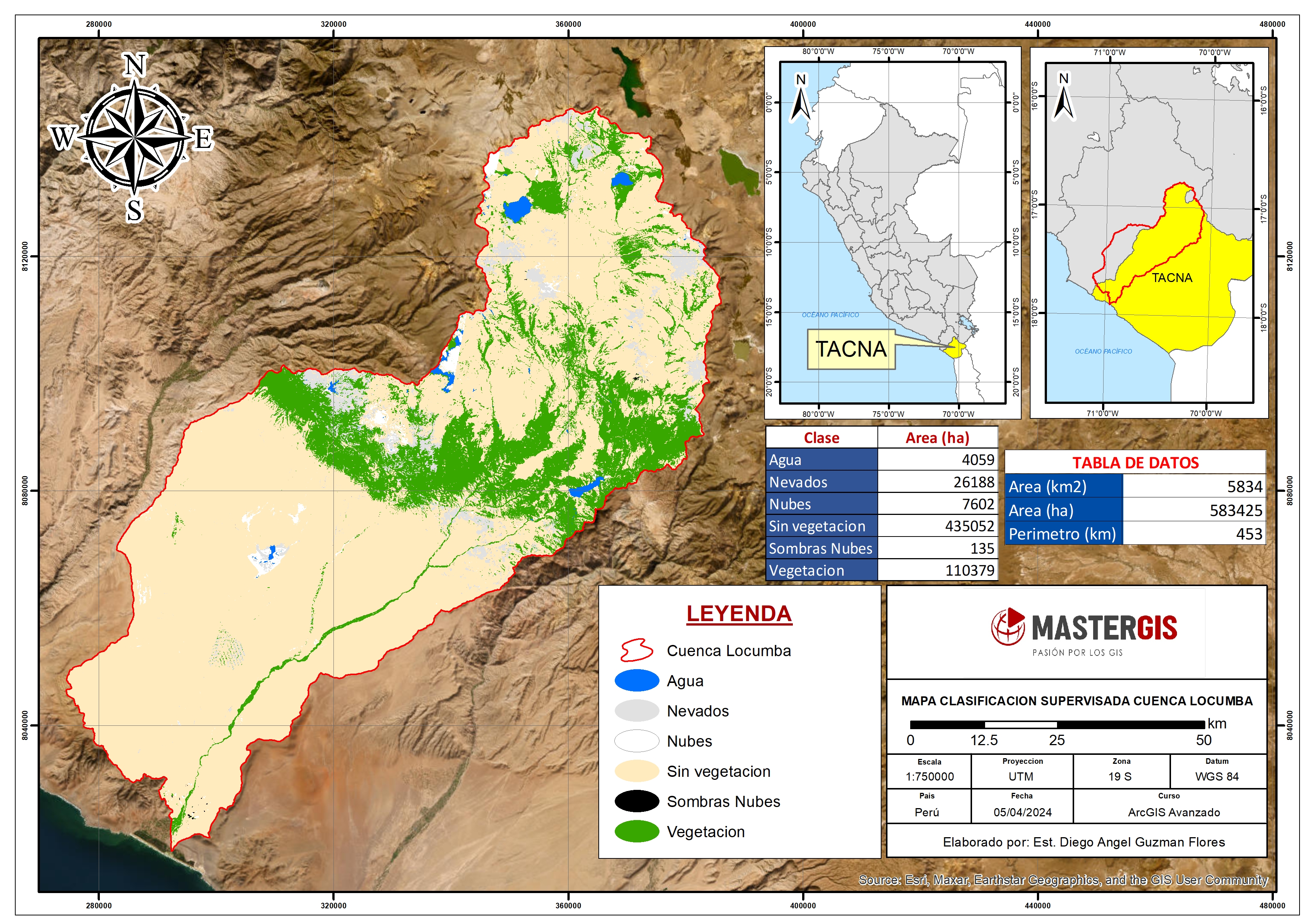 El mapa de clasificación presenta el uso y cobertura del suelo en la cuenca Locumba, obtenido a través de una clasificación supervisada en 6 categorías principales.
