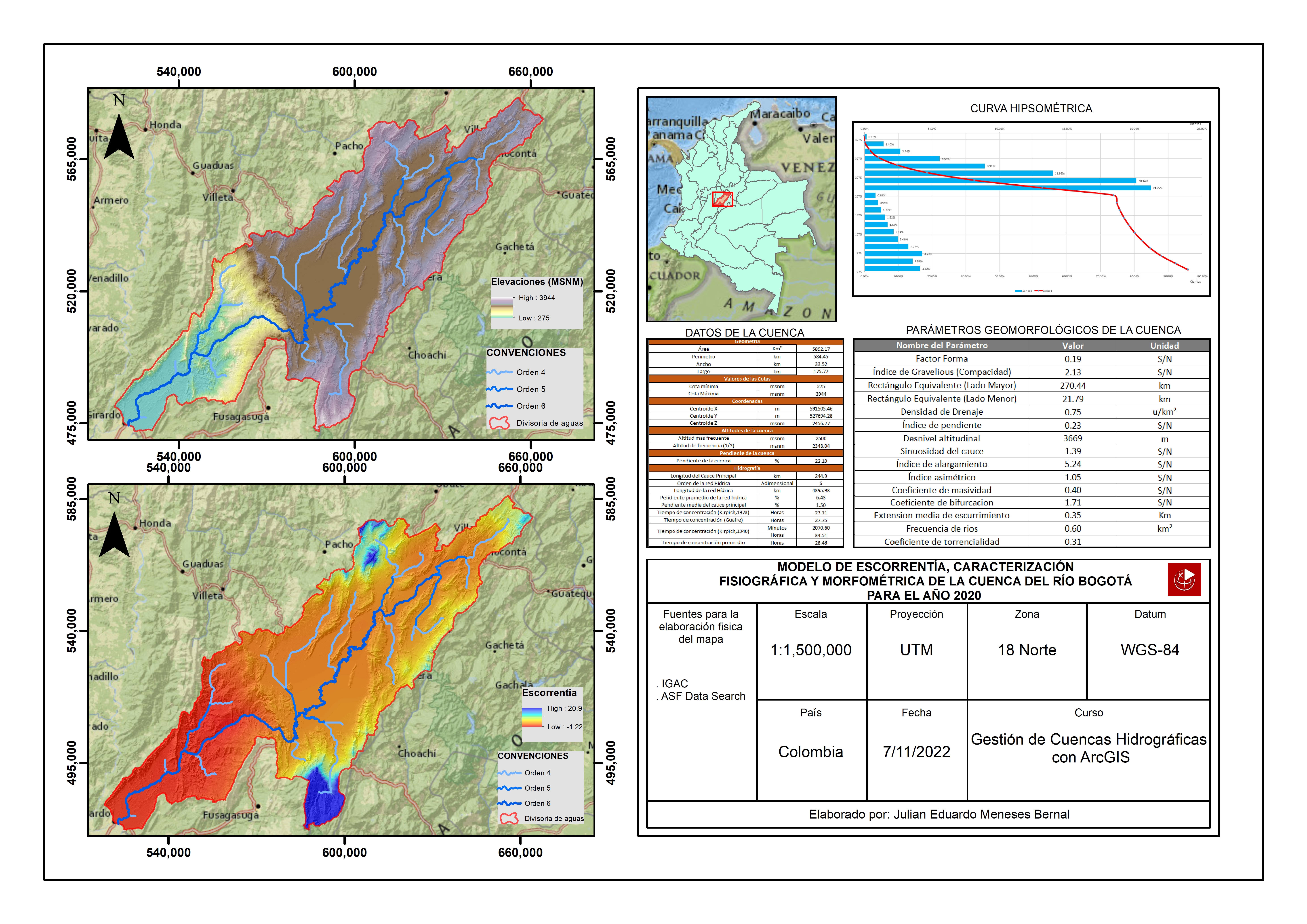 El seguimiento de los procesos planteados en los flujogramas arroja productos de los cuales debemos extraer y aplicar diferentes fórmulas con el fin obtener los parámetros fisiográficos y morfométricos de la cuenca con sus respectivas unidades de medida. Para la interpretación del modelo de escorrentía, se usaron datos de precipitación (mm) y temperatura (°C), en donde por de la aplicación de las fórmulas descritas en la ilustración 4, 5 y 6 se obtienen el modelo de escorrentía el cual nos mostrara la cantidad de agua en m3 que sale de la cuenca.