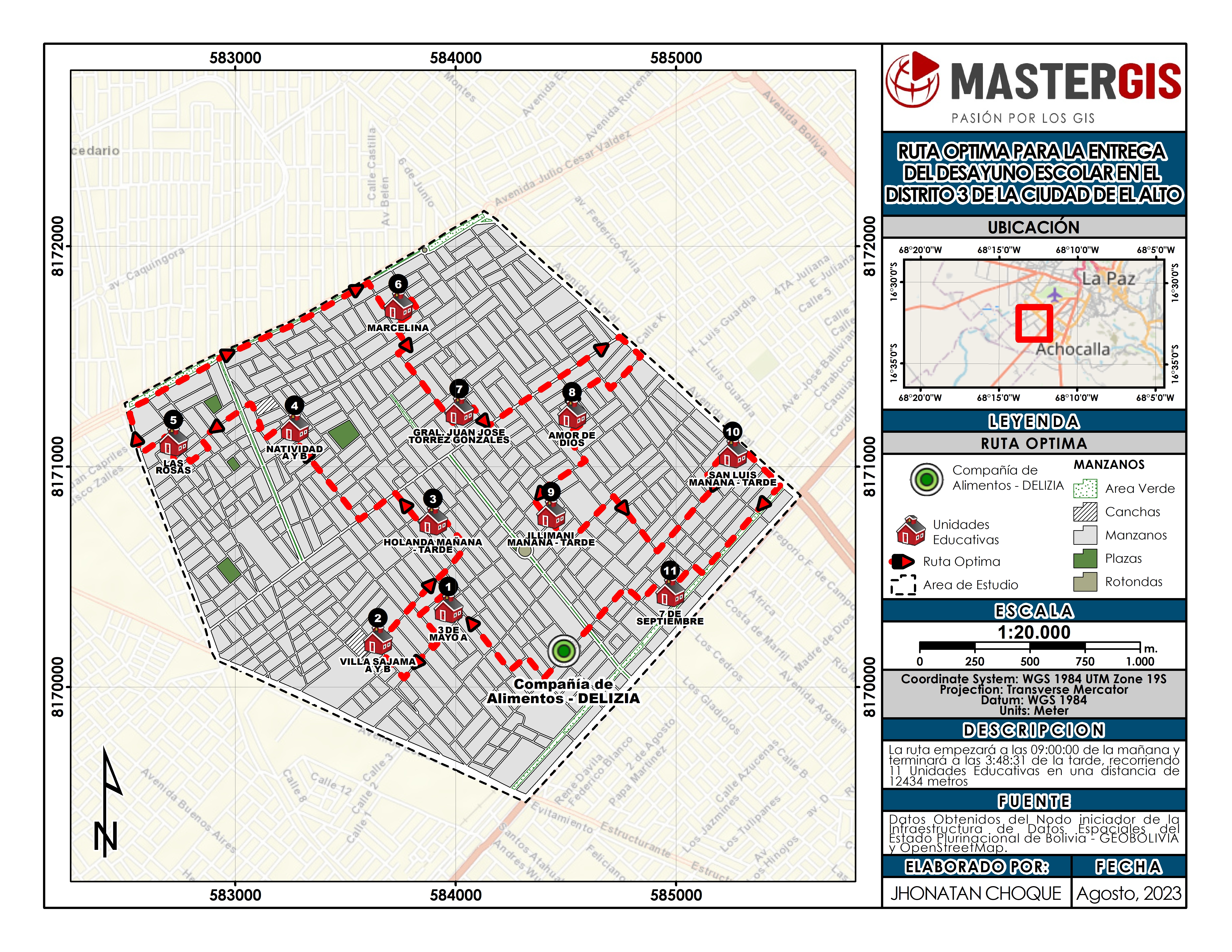 Es por eso que se quiere implementar con ayuda de la extensión Análisis de Redes (Network Analyst) en ArcMap, una ruta optima como una alternativa para la entrega del desayuno escolar en el distrito 3 de la Ciudad de El Alto, que describa el tiempo de llegada a cada unidad educativa y la distancia que lo recorre, si en un futuro la empresa de alimentos Delizia gana una licitación con la alcaldía de El Alto.
