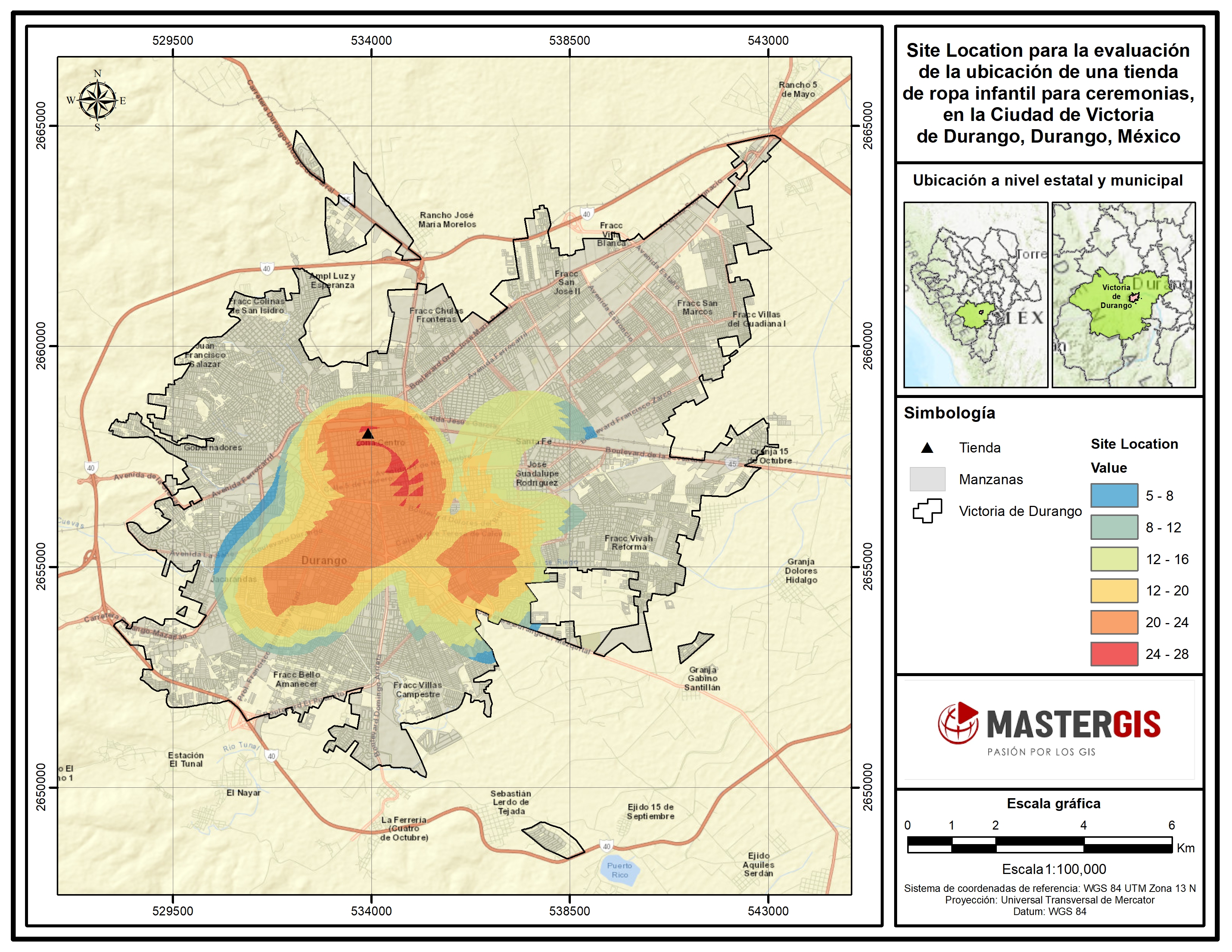 Obtener un mapa de calor a través de la suma de las variables: clientes, unidades económicas y posibles clientes, con Site Location para la evaluación de la ubicación de una tienda de ropa infantil para ceremonias, en la Ciudad de Victoria de Durango, Durango, México.