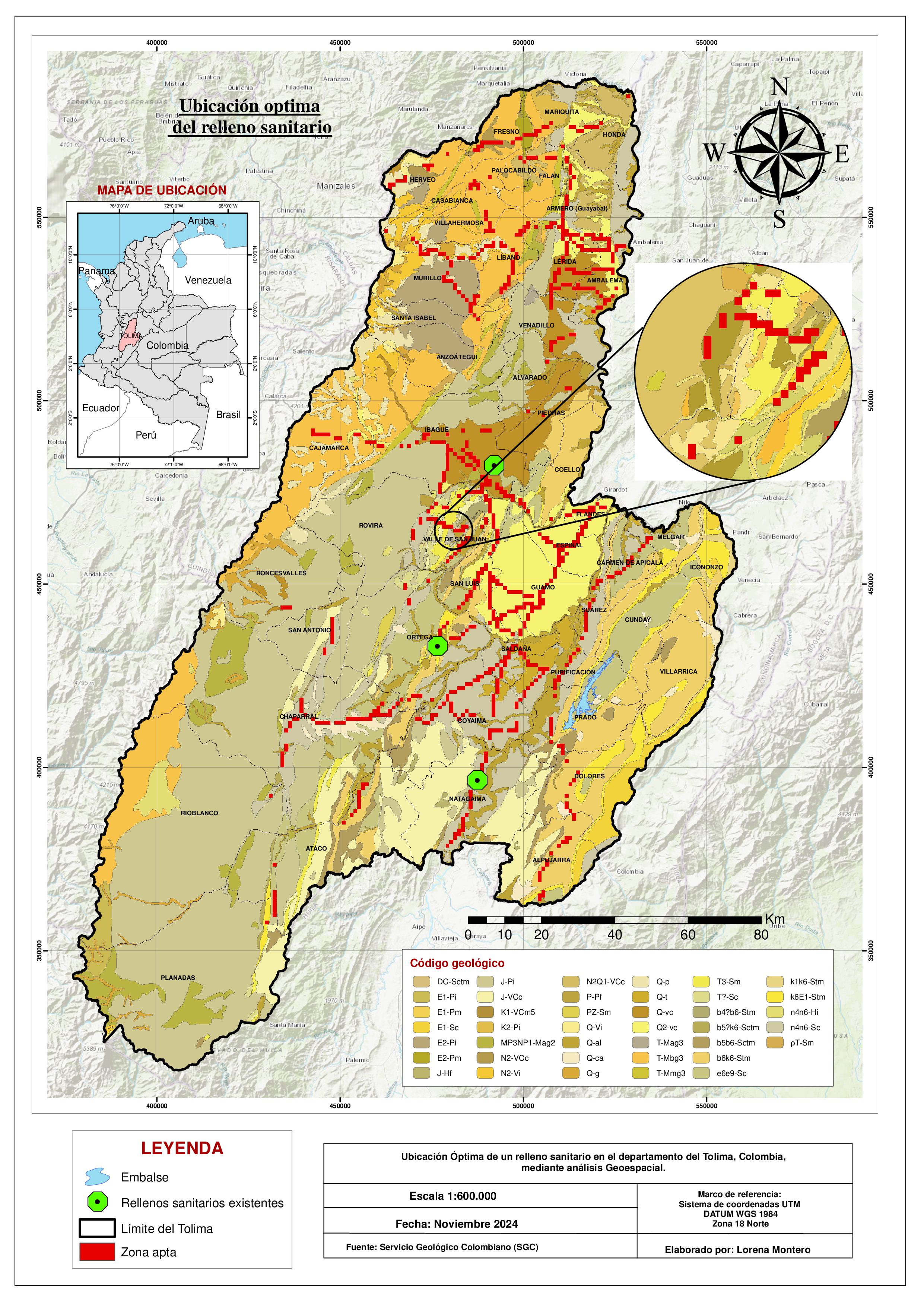 En este contexto, el presente proyecto tuvo como propósito identificar las áreas óptimas para la ubicación de un nuevo relleno sanitario en el departamento del Tolima. Para ello, se recopiló información clave sobre las variables que condicionan su instalación, específicamente aquellas relacionadas a la localización de centros poblados, red vial, red hidrográfica, áreas naturales protegidas, distribución de pendientes y fallas geológicas. Todo esto con fines de identificación de zonas de exclusión o espacios no aptos, para garantizar que el impacto ambiental sea mínimo y que las comunidades cercanas no se vean negativamente afectadas. El proyecto también resultó en la generación de un mapa temático que permitió visualizar las zonas más adecuadas para la instalación de un relleno sanitario. Este mapa fue el resultado de un análisis espacial en el que se integraron herramientas de sistemas de información geográfica (SIG), especialmente del software ArcGIS.